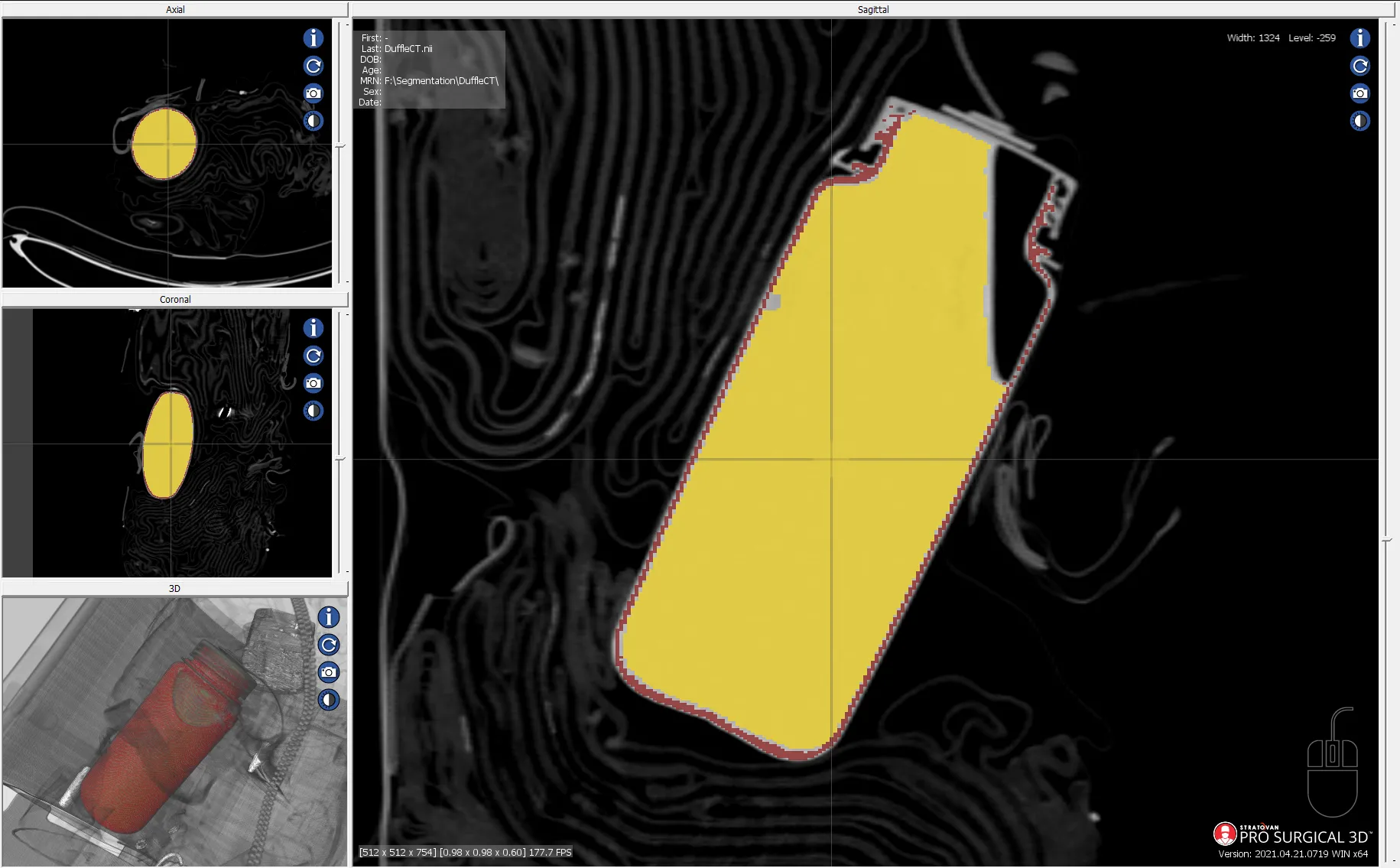 However, the utility of segmentation software extends beyond the realm of medical imaging. Consider the challenge of analyzing CT scans of bottled liquids. Segmentation isn't just about identifying anomalies within tissues; it's also about accurately delineating containers and their contents. With Segmentation for Pro Surgical 3D, even the most complex structures are effortlessly segmented. Whether it's delineating the contours of a bottle or isolating the liquid within, the software's robust algorithms ensure a level of precision that is indispensable in various industries, from pharmaceuticals to manufacturing. This is especially critical in the security landscape where threat objects can often be hidden in everyday-use items like water bottles, shoes, or plastic food containers. Segmentation software like this needs to allow users to clearly segment objects and items that are touching one another and allow algorithms to train on those difficult circumstances. Below, Segmentation for Pro-Surgical 3D shows the clear segmentation of the liquid container (bottom left) while delineating the liquid within the container as a distinct and separate entity. This differentiation is critical when training detection algorithms to understand the differences between items/objects of interest and benign containers they might be held within.