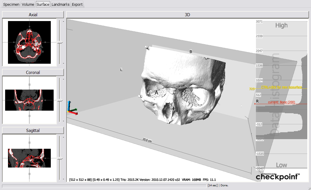 Checkpoint’s surface tab presents the loaded surface or the volume’s isosurface in the 3D window.