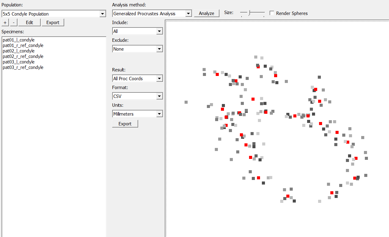 The procrustes superimposition method calculates the procrustes average specimen, which removes scale from the specimens. The following covers the options available in Checkpoint’s Shape Analysis tab. Under “Analysis method”, select “Generalized Procrustes Analysis”. Each specimen in the population must have had landmarks added in the same order for the analysis to function properly.