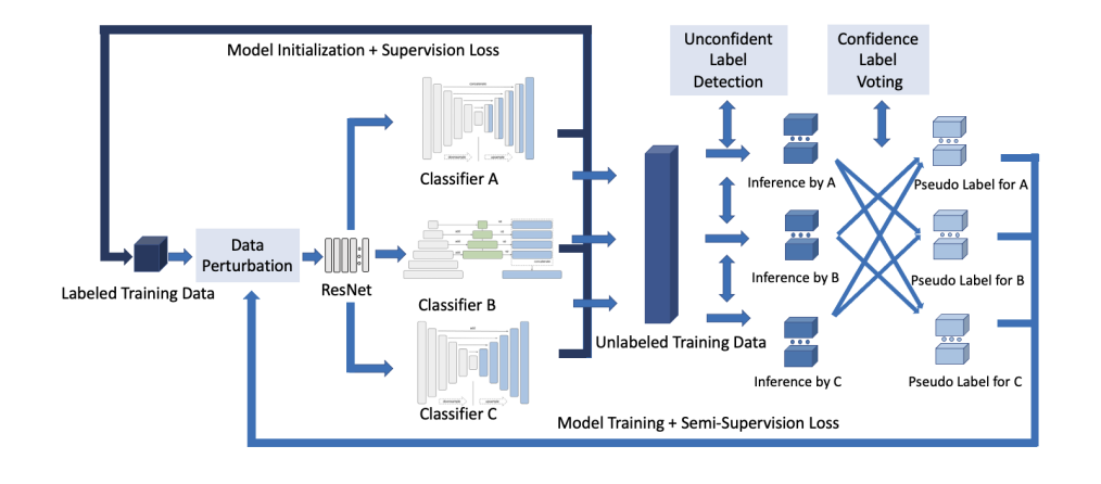 - TriSegNet is a semisupervised semantic segmentation framework that was proposed by Oxford researchers. On a sizable amount of unlabeled data and a small amount of labeled data, it employs triple-view feature learning. The triple-view architecture consists of three pixel-level classifiers and a low-level shared-weight learning module. Labeled data are used to initialize the model. Label processing, comprising data perturbation, cofidence label voting and unconfident label detection for annotation, enables the model to learn on labelled and unlabeled data simultaneously. The other two views of feature learning increase the confidence of each model. Four publicly accessible benchmark datasets, comprising ultrasound, CT, MRI, and histology pictures, are used to evaluate the segmentation findings.